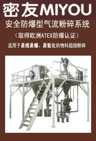 密友安全防爆型氣流粉碎系統(tǒng)采用先進的觸摸屏、可編程PLC控制器,實現(xiàn)了全自動控制。適用于易燃易爆、易氧化的物料,廣泛應(yīng)用于金屬、西藥、中藥、農(nóng)藥、化工、化學(xué)危險品、易產(chǎn)生靜電物料的超細粉碎。