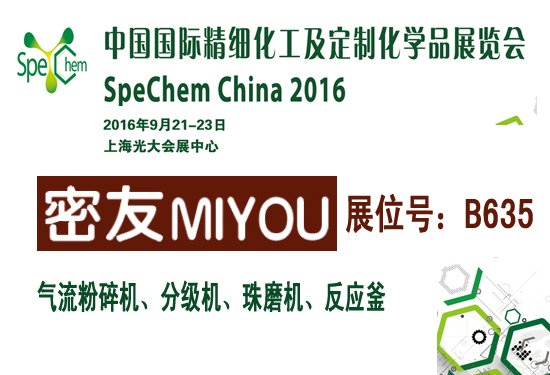 密友集團(tuán)攜旗下粉體裝備制造及化工機(jī)械參加此展,展位號:B635,歡迎屆時蒞臨!屆時密友將展示新一代深冷超細(xì)粉碎高分子材料氣流粉碎機(jī)、惰性氣體保護(hù)氣流粉碎機(jī)、新一代高精微米分級機(jī)、納米砂磨機(jī)等粉體設(shè)備及高壓反應(yīng)釜、攪拌分散釜等化機(jī)產(chǎn)品。